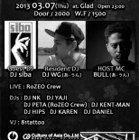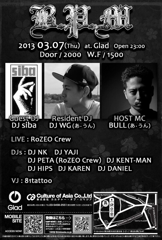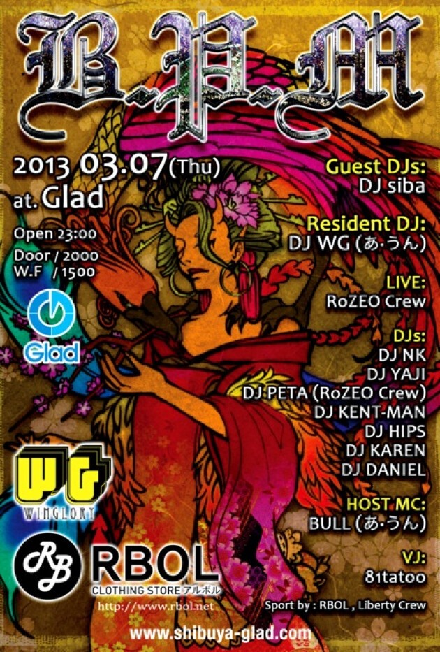 今話題になってる飲み放題Partyではなく、完全"音勝負"!!!!どのイベントよりも良い質のMusicをお届けします‼2012年話題になった、加藤ミリヤ、清水翔太、HAN-KUN、西野カナ、May J.、BENI、青山テルマ、三代目J Soul Brothersなど超豪華アーティストが出演した、MTV Japan主催『ZUSHI FES 2012』にDJ出演を果たした『DJ WG』をResidentに迎え、1発目から大盛況の結果を残した『B.P.M』 VISION,HARLEM,Camelot,axxcisなど誰もが知っているCLUBでPlayしてるDJが一晩中フロアを沸かせます!!!! 90sから新譜まで、芯のある"HIP HOP"をお届けし、常に新しいムーブを発信するのもこのPartyの醍醐味!! そしてLoungeフロアーではエレクトロ,ハウス,誰もが知ってる4つ打ちで、まったく休ませません!!!! 一夜を通して、LIVE陣,DJ陣,@Gladスタッフと皆様で素敵な時間を........