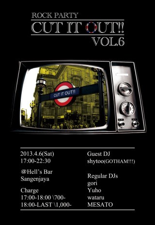 【ロックンロール・リバイバル世代のDJ陣がUK Rockを軸にプレイするRock Party、Cut It Out!!UK Rock好きが集まって、大好きなUK Rockを聴きながら、歌ったり踊ったり・・・。ここはそんなUK Rock好きなら誰もが想うことが叶う場所デス!!60'sから最新曲まで、UK Rockを中心にUSから邦楽、エレクトロまで、Cut It Out!!DJsが幅広く素敵な選曲でUK好きなあなたに最高の時間をお届けシマス!!クラブイベント、UK Rock初心者でも大丈夫!!敷居の低さもCut It Out!!の魅力デス!!安心の17時オープン、低いチャージ料金であなたのお越しをお待ちしていマス!!】