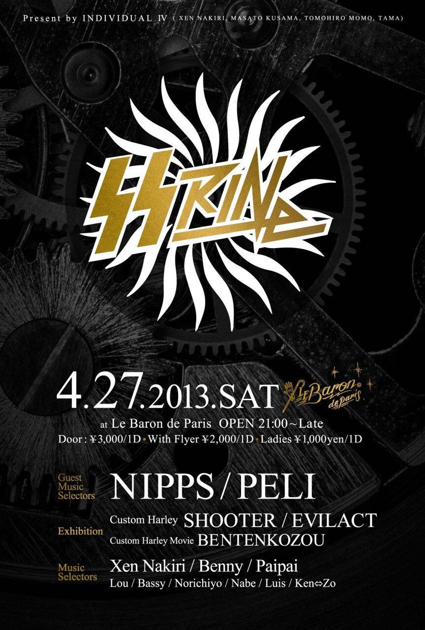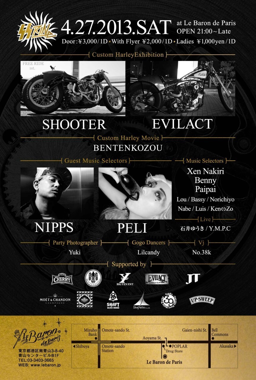 ナイトクラブから新たなカルチャーを発信する。そのことをコンセプトに、音箱でもない、ナンパ箱でもない、カルチャーの発信地としてファッションやミュージック、映画やアートに紐付くパーティーを夜な夜な催してきたLe Baron de Paris。東京唯一無二の大人の社交場として恒久なスタイルを保ちつつも、新たに革新的なチャレンジを願う私たちINDIVIDUAL Ⅳは、【Motorcycle】をテーマに【SS RINe】を開催します。モーターサイクルと言うと幅広いですが、私たちが着目したのは、カスタムハーレーです。そこで専門誌に掲載された実績のあるカスタムハーレー実車を展示し、ファッションブランドやアクセサリーブランドの協力の元、東京で活躍するDJやLIVE PERFORMOR,DANCER VJを迎え、会話が弾み、ドリンクが進む、そして最高の音楽が絶えない、お客様を第一に考えた革新的なクラブイベントです。
