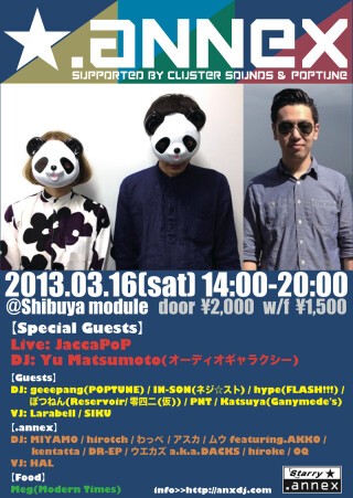 スペシャルゲストに、圧倒的なライブパフォーマンスで魅せるJaccaPoP、そして“.annex”の原点ともいえる“オーディオギャラクシー”よりYu Matsumotoを迎え、6時間の宇宙旅行を開催。出航は14時@module。乗り遅れるな!