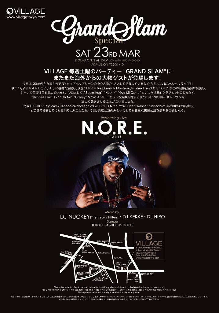 VILLAGE毎週土曜のパーティー"GRAND SLAM"にまたまた海外からの大物ゲストが登場します!今回は、90年代から現在までNYヒップホップシーンの中心人物の1人として活躍しているN.O.R.E.によりスペシャルライブ!!今年1月よりP.A.P.I.という新しい名義で活動し、現在"Tadow feat.French Montana, Pusha-T, and 2 Chainz"などの新譜を活発に発表し、シーンで再び注目を集めています。ソロとして、"Superthug" "Nothin" "Oye Mi Canto"といった世界的クラブヒットのみならず、"Banned From TV" "Oh No" "Grimey"などのストリートヒットも多数所持する彼のライブはHIP-HOPファンを決して飽きさせることがないでしょう。勿論HIP-HOPファンならCapone-N-Noreagaとしての"T.O.N.Y." "Y'all Don't Wanna" "Invincible"などの数々の名曲も、どこまで披露してくれるか楽しみなところ。今回、東京公演のみというとても貴重な来日公演を是非お見逃しなく。