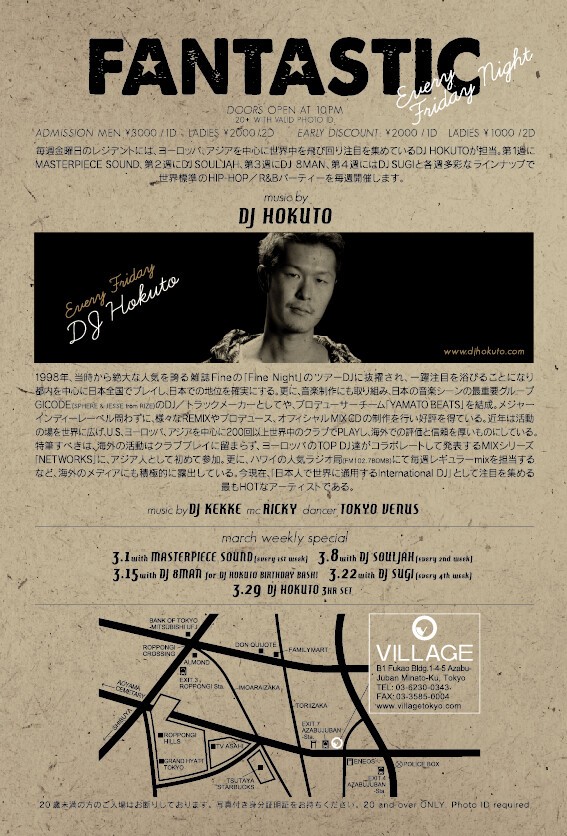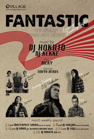 毎週金曜日のレジデントには、ヨーロッパ、アジアを中心に世界中を飛び回るDJ HOKUTOが担当します。第1週にMASTERPIECE SOUND、第2週にDJ SOULJAH、第3週にDJ KANGO(DJ 8MAN)、第4週にDJ SUGIと各週多彩なラインナップで、世界標準のHIP-HOP/R&Bパーティーを毎週開催します。、第4週にDJ SUGIと各週多彩なラインナップで、世界標準のHIP-HOP/R&Bパーティーを毎週開催します。