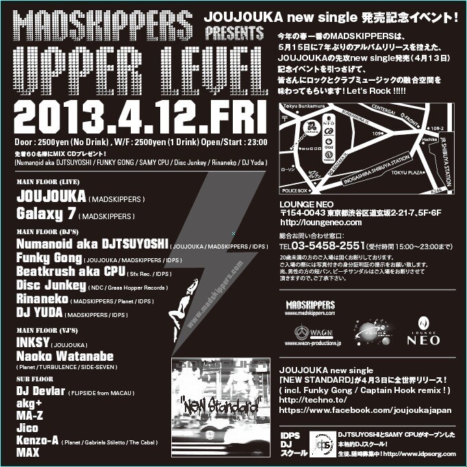 今年の春一番のMADSKIPPERSは、5月15日に7年ぶりのアルバムリリースを控えた、JOUJOUKAの先攻new single発売(4月13日)記念イベントを引っさげて、皆さんにロックとクラブミュージックの融合空間を味わってもらいます!Let's Rock !!!!!