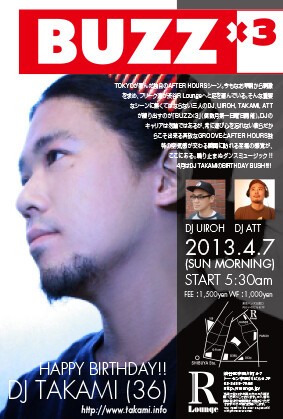 そんな重要なシーンに無くてはならない三人のDJ、UIROH, TAKAMI, ATTが繰り出すのが「BUZZ×3」(偶数月第一日曜日開催)。
