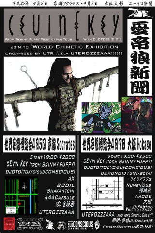 NINやMINISTRYに多大な影響を与えたであろうSKINNY PUPPYのトラックメーカーcEvin KEyと彼自身が運営するSUBCONCIOUS COMUNICATIONSの所属アーティストDJOTOの関西初上陸ツアー!!地元京都・大阪さらに7日大阪Hokageには名古屋からも強力過ぎるゲストを迎えて、UTR aka UTEROZZZAAAが気合のサポート!!