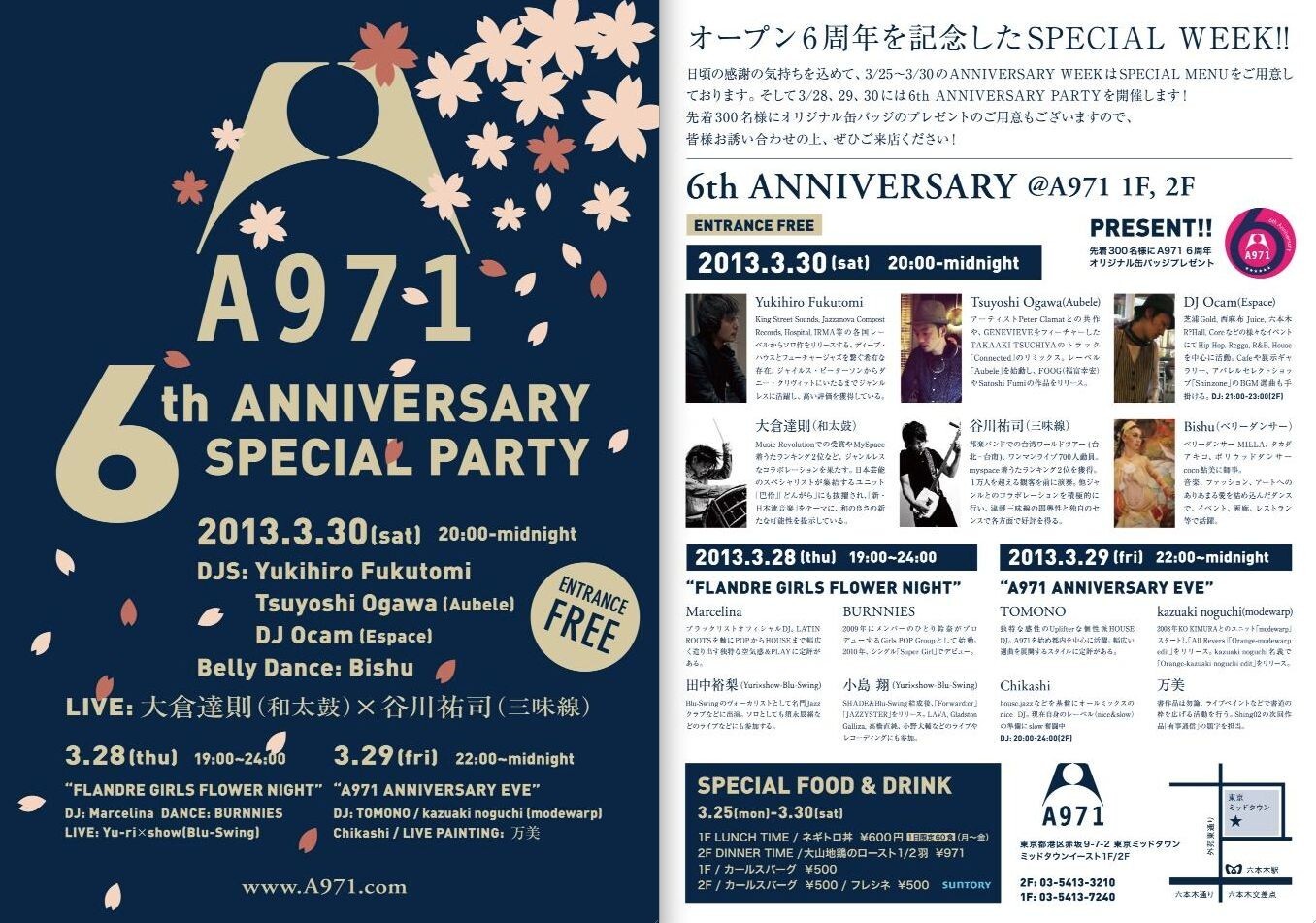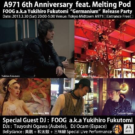 2012年よりスタートした国内気鋭レーベルAubeleがマンスリーで開催するイベントMelting Podと、東京ミッドタウンの玄関としてしられるA971の6th Anniversaryのコラボレーションパーティーの開催が決定。今回は、Aubeleから3/25にEP「Germanium」をリリースするFOOG(福富幸宏)のリリースパーティーに加え、春のスペシャル企画として、DJ、和太鼓、三味線、ベリーダンスのライブセッションが実現。更に店内には、本物の桜の装飾を施し、雅な魅力に溢れた「和の春」を演出する。文化の垣根を越えた豪華コラボイベントは東京の春を鮮やかに彩ることだろう。