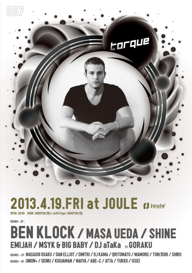 日本/環太平洋からワールドワイドにシーンを活性化させるべく立ち上がった国産テクノレーベル【Torque】。大阪と東京を中心にスキル重視な海外・国内アーティストを交える至高のニュースクールミニマルパーティーを展開中。前回006では上海、北京、アメリカ・ポートランドでの海外遠征もこなし一層の進化を続けるTorqueレーベルナイト第7弾に、ベルリンを代表するクラブ"Berghain"のオープン当初よりレジデントDJを9年間務め、DVS1やMarcel Dettmannらと共にベルグハイン・ミュージックの基盤を作った「Ben Klock」がトルクに登場する。今回のTORQUE 007は大阪のみのLimited開催となり、より希少な一夜を大阪・CLUB JOULEからお送りします。