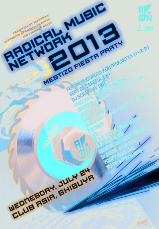 RICO RODRIGUEZ、LAUREL AITKEN、FERMIN MUGURUZA、BANDA BASSOTTI、BUNNY GANG feat NATHEN MAXWELL of FLOGGING MOLLY、BOIKOT、KING PRAWN (from ASIAN DUB FOUNDATION)、DJ SCRATCHY (from THE CLASH)、FIDEL NADAL (from MANO NEGRA & TODOS TUS MUERTOS)、VERY BE CAREFUL、ESNE BELTZA、LA RUDA、CHE SUDAKA、OBRINT PAS、MATE POWER、MALLACAN、BRAHMAN、THE 3PEACE、PEALOUT、DACHAMBO、THE ZOOT 16、BUSH OF GHOST、勝手にしやがれ、COOL WISE MAN、TURTLE ISLAND、DOBERMAN等の伝説的アーティストの出演で話題のRADICAL MUSIC NETWORK。日本にはない新しいREBEL MUSICという音楽の種を植えたい!とJAPONICUSが始めた日本のREBEL MUSICの草分け的イベントである。過去にはFERMIN MUGURUZAとTHIN MAN (痩人)を迎えて中国でも開催され、2009年にはTURTLE ISLANDと共にバスク公演を果たした。さらに2009年には、フジ・ロック・フェスティバルでのイベント開催を決行。新鮮な驚きと興奮で、クリスタル・パレスは一時入場制限が出たほどの盛り上がりを見せた。2011年にはCARIBBEAN DANDY & EKDと共に3度目となる海外ツアーRADICAL MUSIC NETWORK SOUTH EUROPE TOURを決行。2012年の夏にはCARIBBEAN DANDY & TEX & SUN FLOWER SEEDと共にバスク、フランス、スペイン公演を決行。さらに去年の12月にはCARIBBEAN DANDY & VERY BE CAREFULと共にアメリカ公演を実現させ大きな反響を呼んだ。そんなRADICAL MUSIC NETWORKに今回バスクの伝説レベルアーティストFERMIN MUGURUZA KONTRAKANTXA、そしてTHE CLASHのジョーストラマーが惚れ込んだクンビアバンド、VERY BE CAREFUL、そしてロンドンからザ・クラッシュのツアーDJ「SCRATCHY」が再参戦!! MESTIZO (混血)、ROCK LATINOという数年前までは殆ど知られていなかった音楽ジャンルだが、今ではレコード店や雑誌がこぞってMESTIZO特集を組むほど人気が上がっている。今回のRADICAL MUSIC NETWORKは「SP MESTIZO FIESTA PARTY」で、思う存分REBEL MUSICをはじめとするMESTIZO・CUMBIA・PATCHANKA・CUARTETO・REGGAE・SKA・PUNK・ラテン音楽を楽しめる企画になっている。何が起こるかわからない!?日本のレベルミュージックを代表するCARIBBEAN DANDY、91年にMANO NEGRAと共演を果たしたレピッシュのMAGUMIさんのバンドMAGUMI & THE BREATHLESS、TOKYO No1 SOUL SETとTHE ZOOT 16の渡辺俊美、浅草ジンタ、光風 & GREEN MASSIVE、SKAFF-LINKS、SHOW441 (from EL SKUNK DI YAWDIE)、PACINOS。EKD、TEX & SUN FLOWER SEED、DUB BASTARDS等の刺激的な実力派アーティストの共演にも注目です!