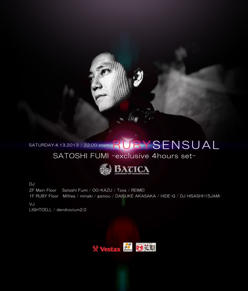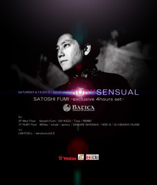 いつものSENSUALとは違いメインフロアーではSatoshi Fumiが4hロングセットを披露する。