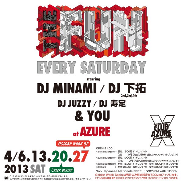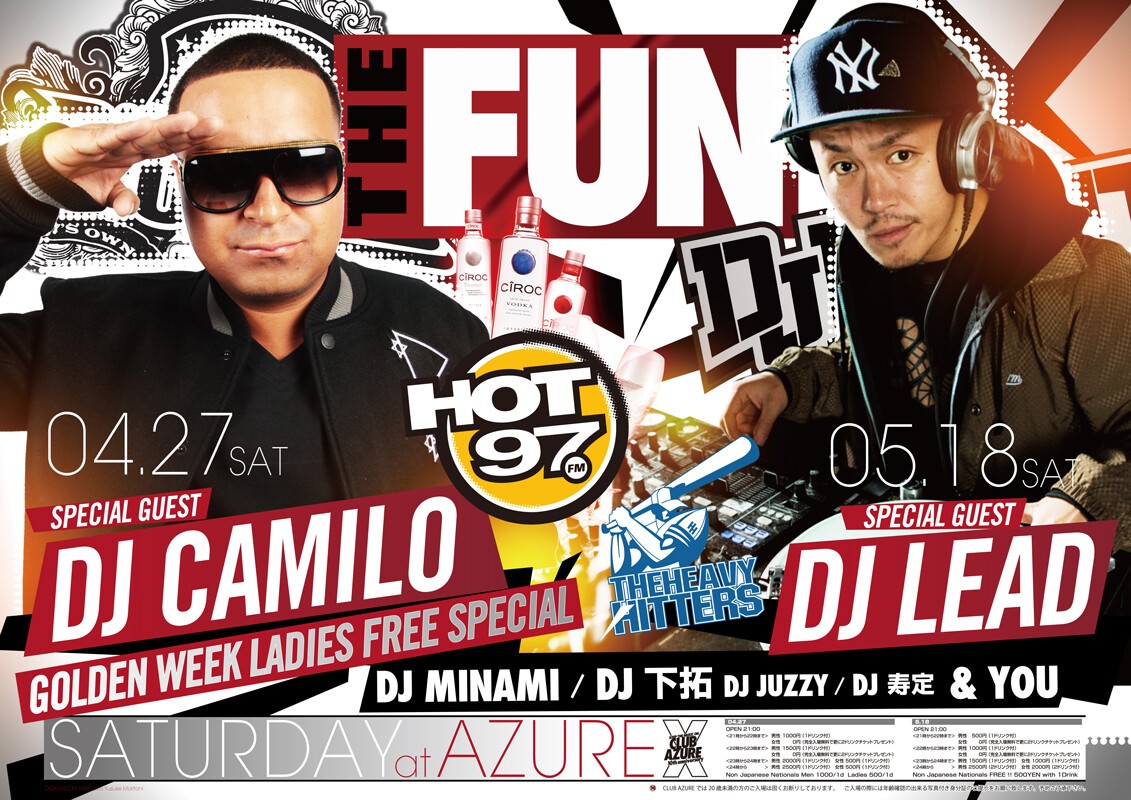 知らない人は無し、大阪いち有名なこの場所この曜日この時間。SOUL FOOD、SATURDAY AZUREに続く、毎週土曜日の新定番パーティー『THE FUN』が、2011年10月より始動!DJ MINAMI & DJ 下拓の、揺るぎないツートップは勿論、アーリータイムから、HipHopを中心にR&BやReggae、また近年のチャートを賑わすダンスチューンなど幅広い選曲が楽しめます!関西クラブ遊びの登竜門とも言える『土曜日のアズール』には、本当に色んな人が遊びに来ており、毎週来ても新たな音楽・お酒・友達と出会える、チェック必至のパーティーです!出会いの秘訣は、何より“楽しむ”こと!週末土曜日の夜を素敵なものにしたいパーリーピーポー達よ!JUST HAVE FUN!!