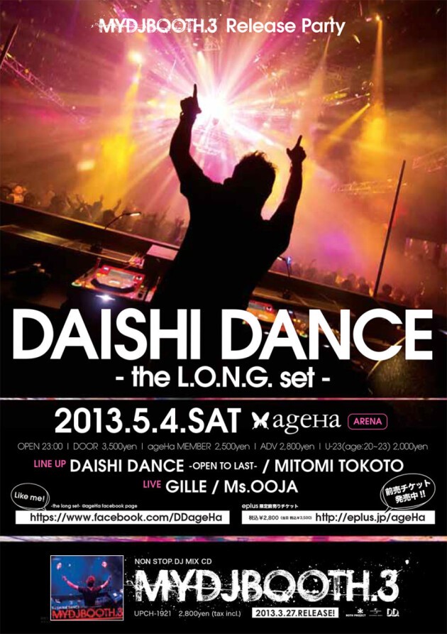 3月27日に発売になったmix CD "MYDJBOOTH.3"を記念してリリースパーティーを開催!!! DAISHI DANCEのロングセットに加え、ゲストDJとして盟友MITOMI TOKOTOが登場。更にこの二人とそれぞれにコラボ曲を持つボーカリト、GILLEとMs.OOJAがライブで出演。ISLANDエリアにはJ-WAVEからDJ TARO、WATERにはRYUKYUDISKOなど豪華ゲストが登場。ageHaならではのエンターテイメントパーティーが展開される!!!