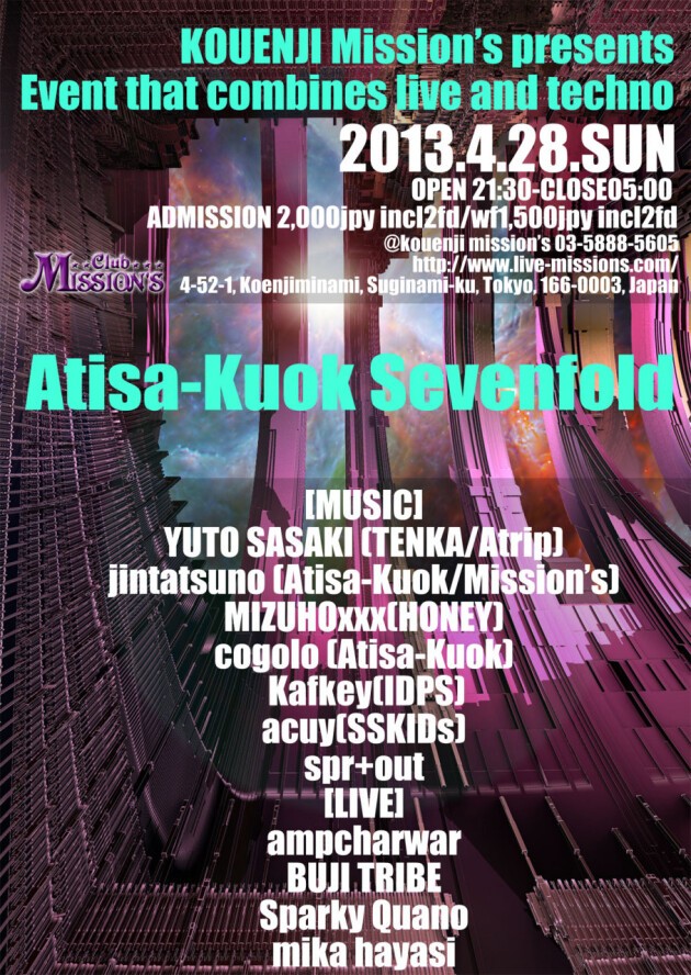 【Description】LIVE HOUSEの旧態然とした状況を喝破すべく新風を吹き入れることをテーマに発足した高円寺独自のTechno party。Impulsus fridayとならび、グッドミュージュクを愛するクラウドから着実な支持を集め始めている。今回は7回目、3連休中の中日ということでDJのみならず、屈強かつビビッドな異彩を放つLIVEを4組加え、Inpulsus fridayに準じたタイムテーブルを用意して鉄壁の布陣を敷いた。高円寺のnight lifeでは既に顔役と言ってもよい面々でお届けする。目玉はなんといってもTENKAのオーガナイザーにしてAtripなど超人気イベントで活躍、多くのビッグネームとの共演を果たしてきたYUTO SASAKI。深遠且つ優艶な、うねるような音で、宇宙空間を彷彿とさせるグルーヴを生み出す彼のプレイは必見。そして、当イベントのオーガナイザーにしてミッションズの店長、高円寺に深夜の音楽文化を浸透させようとする第一人者でありデトロイトtechnoを中心にタイトなプレイを魅せるjintatsuno。過去2回の登場でもその美貌からは想像だにしない硬派な音で高円寺のクラウドを沸かせ、尚、都内多数のイベントで活躍し続けるMizuhoxxx。Atisa-kuokでメキメキと実力を付けもはや各界のDJにも引けを取らないクールな世界を展開するcogolo。IDPSから新たなる女性実力派DJとして大注目の参戦をしてくれるkafky。ファンキーかつアグレッシヴな選曲で前回のImpulsus Fridayでも多くのクラウドから高評価を獲得したaucy。そしてオープニングDJには10代の頃からその才覚を発揮してきたspr+outが20歳を迎え参戦。LIVEとしてはハイセンスなオルタナティヴロックサウンドで会場を混沌に陥れるampcharwar。そのクールなライムとラップスタイルでクラウドを魅了し、ミッションズではもはやお馴染みともなった高円寺ナイトライフの王者、BUJI TRIBE。海外ではその異彩とも言える過剰なギタープレイに絶大な支持を持つSparky Quano。哀愁感とキッチュさを兼ね備えた独特のポップセンスで多方面から熱狂的な支持を受けているポップシンガー、林ミカでお贈りする。高円寺二つとないハイセンスなグッドミュージックナイトを是非逃すことなく楽しんでもらいたい。