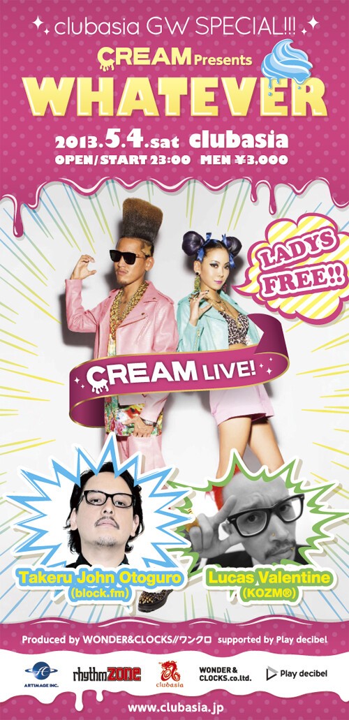 今年2月にメジャーデビュー・アルバム「DREAMIN'」を発表し、急速に知名度を増しているMinamiとStaxx Tによるユニット、CREAM。彼らがGWど真ん中に『WHATEVER』と題したパーティを主催し、アグレッシヴなライヴを決行する。さらに、CREAMの楽曲も手掛けるLucas Valentine、block.fmでもおなじみの実力派DJ:Takeru John Otoguroも出演。そして、KICK OFFやKなど、東京クラブ・シーンを賑わすニュージェネレーションも集結する。しかもこの日はスペシャル・プレゼントとして、女性は入場無料!! ヒップホップ/R&B、そしてエレクトロ〜最新鋭EDMサウンドまでを横断するCREAMとその仲間たちが、最高にエキサイティングな時間をプレゼントする!