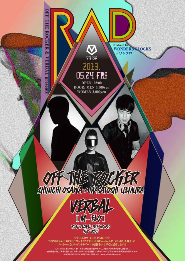 大沢伸一と上村真俊による超攻撃型DJユニット、OFF THE ROCKER。そして音楽~ファッション界で絶大な支持を得る21世紀型マルチ・アーティスト、VERBAL。この両者によるモンスター・イベント『RAD』が、2013年第二弾を迎える。今年2月に初のミックスCD「OFF THE ROCKER Presents SOFA DISCO」を発表したOFF THE ROCKER。そしてVERBALの本隊であるm-floは3月に、オリジナルアルバム「NEVEN」をリリース。新作のリリースを経て、その音楽性をさらにレベルアップさせた両者が、この日、いまだかつてないほどエキサイティングでカオスな空間を生み出す。