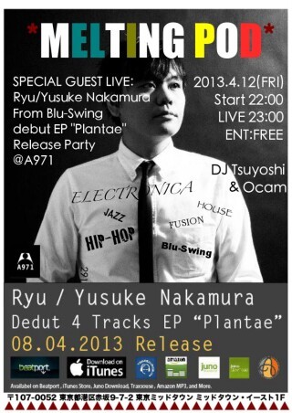 2012年よりスタートした国内気鋭レーベルAubeleがマンスリーで開催するイベント『Melting Pod』にJazzバンド、Blu-Swingのキーボディスト/コンポーザーとして活動するYusuke Nakamuraのソロプジェクト『Ryu』の出演が決定。4/8にAubeleからリリースされたファーストEPからの楽曲を中心スペシャルライブセットを披露する。さらに、今回はRyuと同郷のMC、Shadeとの一夜限りの豪華コラボライブが実現。エレクトロニックミュージックの新たな可能性を切り開くRyuの記念すべきスタートを見逃すな。