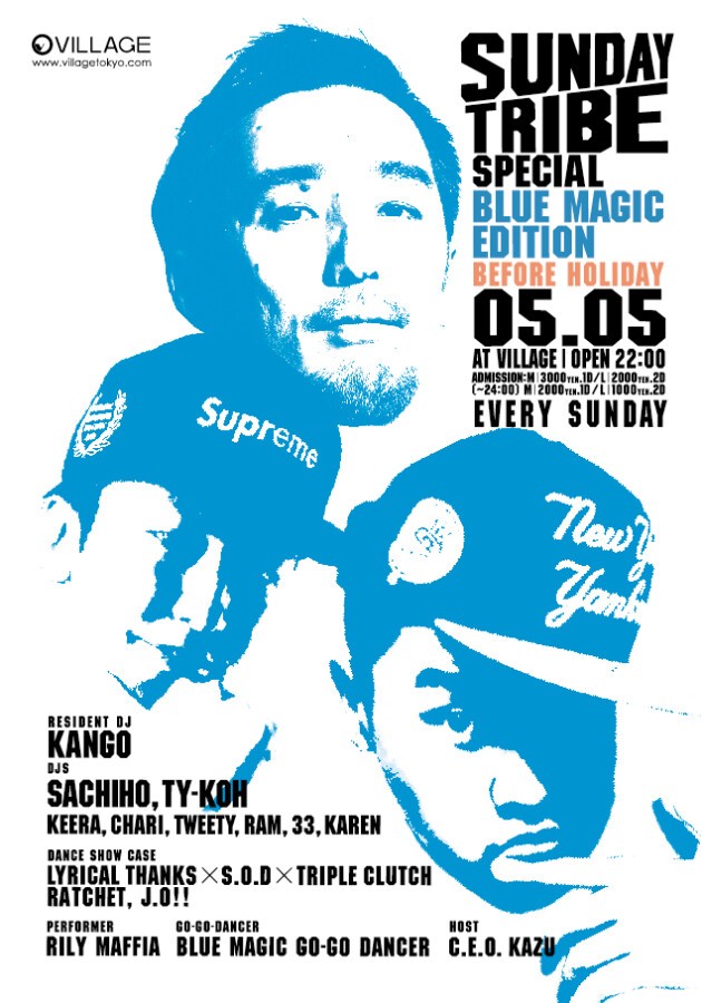金、土だけでは遊びたりないパーティフリークにおくる毎週日曜日のプログラムが送る、GW最後のスペシャル企画。この日は渋谷ELFで毎週火曜日開催されている超人気PARTYとのコラボレーションが決定。純度100%のHIPHOP PARTYと<SUNDAY TRIBE>が麻布十番にて世界標準のHIPHOPを提案するVILLAGEでどんな化学反応をおこすのか、是非ご期待ください。