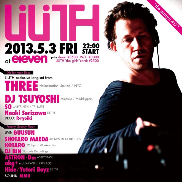 パーティは、楽しくなくっちゃパーティじゃない!!!大好きな、楽しい仲間たちと、笑っちゃうくらいに楽しいパーティしよう!が、今回、約半年ぶりとなるLiLiTH“the party!!!”のテーマ。1年ぶりに帰ってくる、みんな大好きな、LiLiTHのアイドル的存在THREEを筆頭に、なんと今回は、日本を代表するアーティストのひとり、DJ TSUYOSHIもLiLiTHのメインフロアに初登場!サイケデリックなハウスとトランスの融合。。この組み合わせ、おもしろそうな予感がしちゃうでしょ??他の出演者たちも相当なツワモノ揃い。。