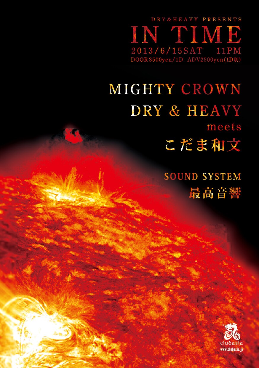 そんなDRY&HEAVYが2012年からスタートさせたイヴェント、その名も〈DRY&HEAVY PRESENTS IN TIME〉。DRY&HEAVY主催のイヴェントは何と初めての試みだというが、その点からもここに込められた秋本と七尾の思いを感じ取ることができるだろう。言うまでもなく、このパーティーは単に出演者の名前で客を集めようとするものではない。このメンバーだからこそ生まれるだろう特別な空間。それはジャンルも世代も越えたものであって、首謀者の秋本は東京の夜に起爆剤(もしくは劇薬)を投下しようとしているのだろう。
