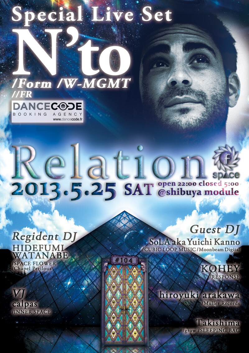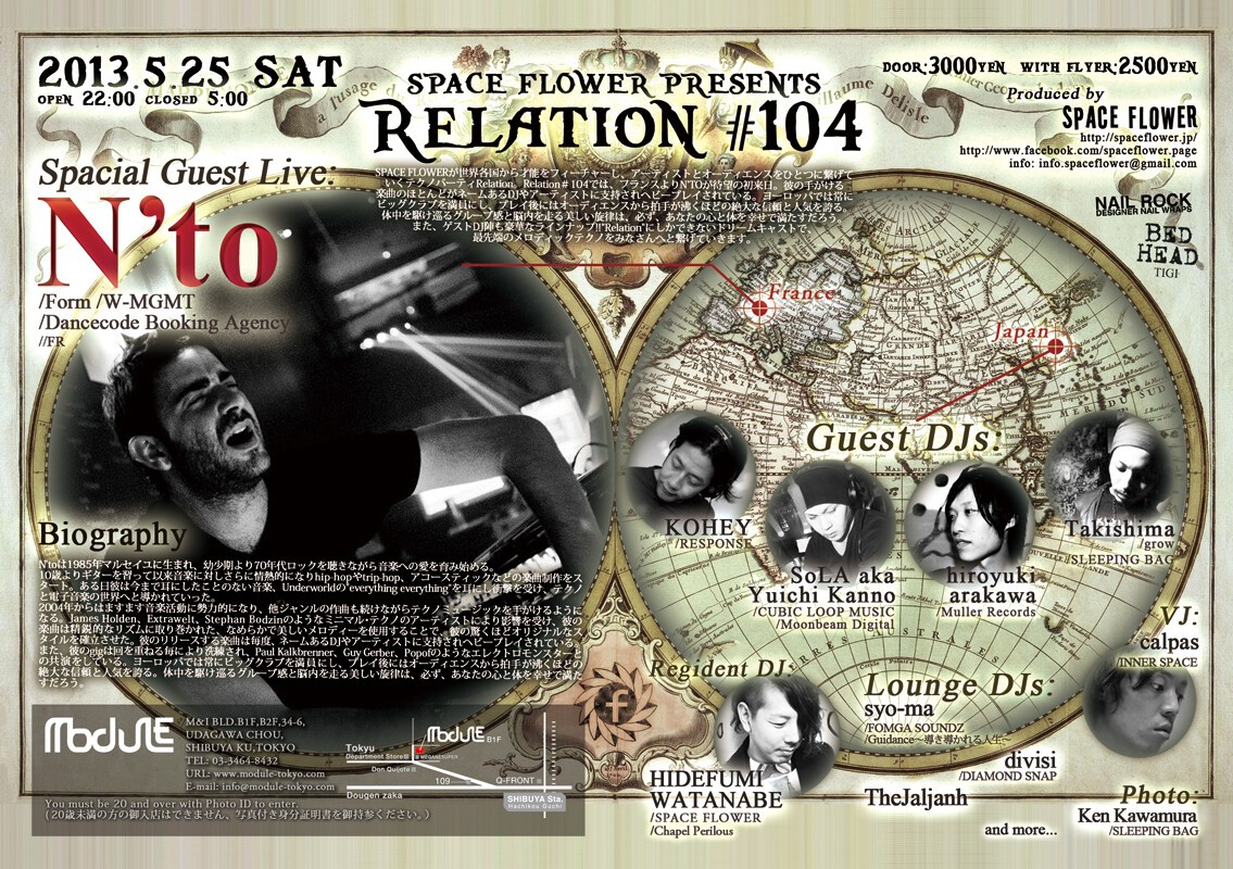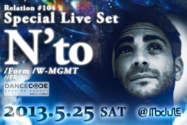 Relation#104では、フランスよりN'toが待望の初来日。彼の手がける楽曲のほとんどがネームあるDJやアーティストに支持されヘビープレイされている。ヨーロッパでは常にビッグクラブを満員にし、プレイ後にはオーディエンスから拍手が沸くほどの絶大な信頼と人気を誇る。体中を駆け巡るグルーブ感と脳内を走る美しい旋律は、必ず、あなたの心と体を幸せで満たすだろう。