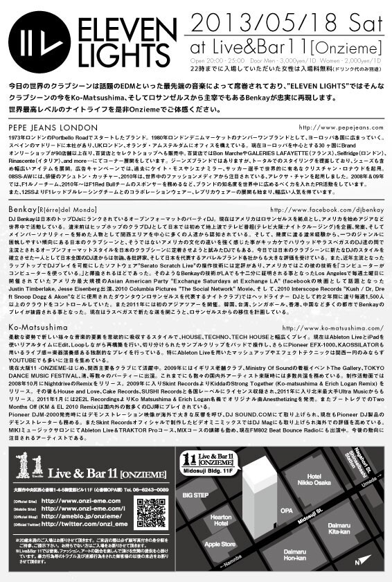 今日の世界のクラブシーンは話題のEDMといった最先端の音楽によって席巻されており、“ELEVEN LIGHT”ではそんなクラブシーンの今をKo-Matsushima、そしてロサンゼルスから主宰でもあるBenkayが忠実に再現します。