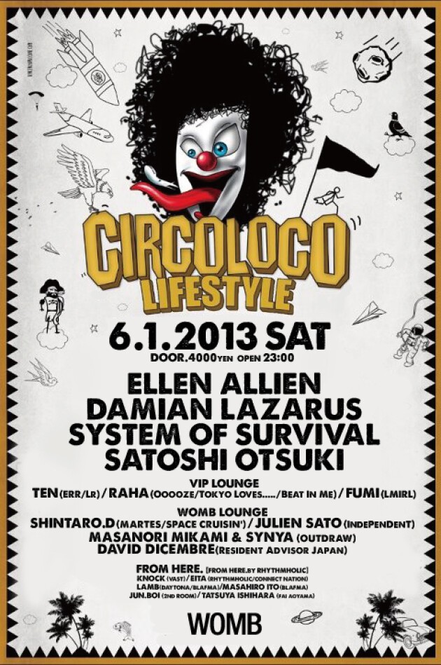 イビサ DC10 の名物アフターパーティー 「CIRCOLOCO」 が日本上陸! もはや 「CIRCOLOCO」 の看板アーティストと言っても過言ではないエレン・エイリアン、ダミアン・ラザラス、システム・オブ・サバイバルの3組が揃って登場。さらに日本から SATOSHI OTSUKI が出演決定。イビサ 「CIRCOLOCO @DC10」 の本場の空気感を味わうことができる貴重な機会をお見逃しなく!