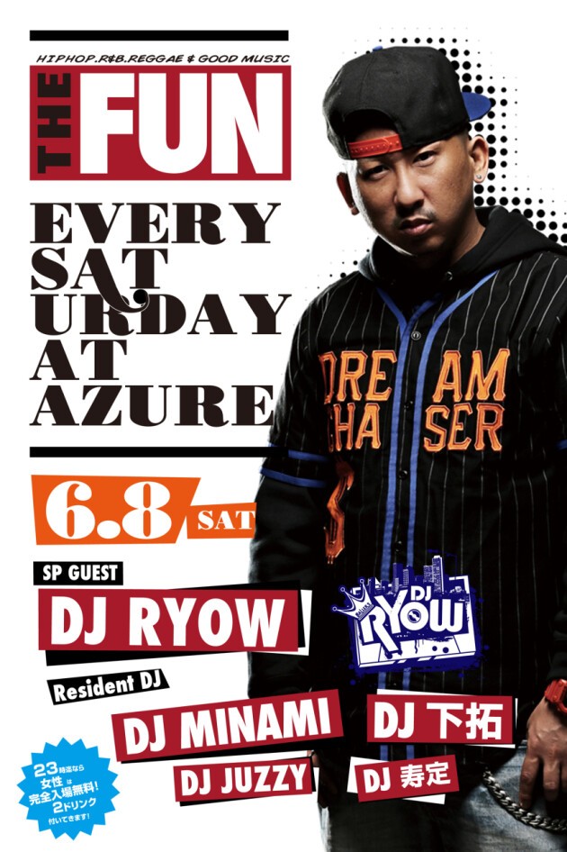 知らない人は無し、大阪いち有名なこの場所この曜日この時間。SOUL FOOD、SATURDAY AZUREに続く、毎週土曜日の新定番パーティー『THE FUN』が、2011年10月より始動!DJ MINAMI & DJ 下拓の、揺るぎないツートップは勿論、アーリータイムから、HipHopを中心にR&BやReggae、また近年のチャートを賑わすダンスチューンなど幅広い選曲が楽しめます!関西クラブ遊びの登竜門とも言える『土曜日のアズール』には、本当に色んな人が遊びに来ており、毎週来ても新たな音楽・お酒・友達と出会える、チェック必至のパーティーです!出会いの秘訣は、何より“楽しむ”こと!週末土曜日の夜を素敵なものにしたいパーリーピーポー達よ!JUST HAVE FUN!!
