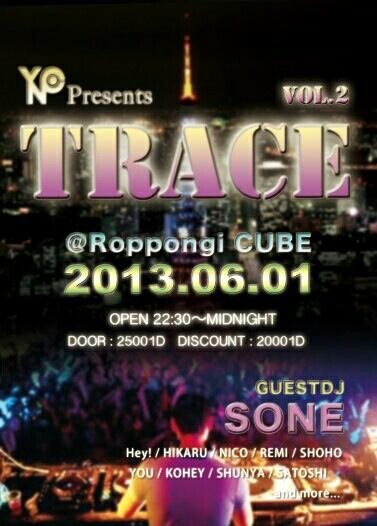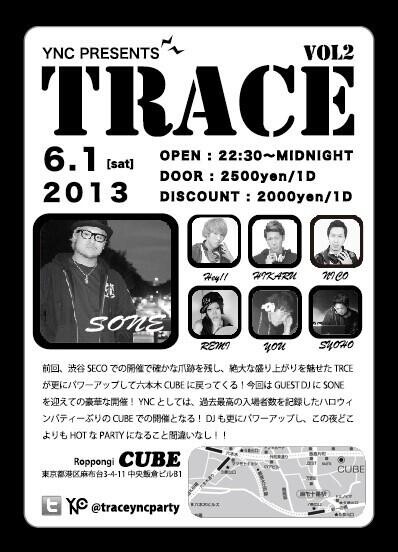 前回、渋谷SECOでの開催で確かな爪跡を残し、絶大な盛り上がりを魅せたTRACEが更にパワーアップして六本木CUBEに戻ってくる!今回はGUEST DJにSONEを迎えての豪華な開催!YNCとしては、過去最高の入場者数を記録したハロウィンパーティー振りのCUBEでの開催となる!DJも更にパワーアップし、この夜どこよりもHOTなPARTYになる事間違いなし!!