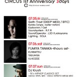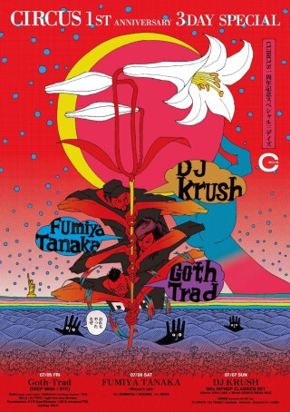 CIRCUS 1st ANNIVERSARY SPECIAL! 初日となる7/5は、ミキシングを自在に操り、さまざまなアプローチでダンスミュージックを生み出すサウンドオリジネイター「Goth-Trad」、ベルリンを拠点としアグレッシヴに活動する奇才女性サウンドアーティスト「Kyoka」が登場!