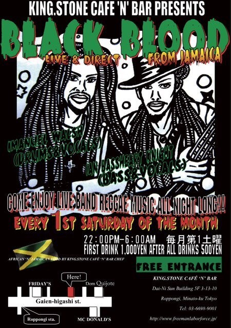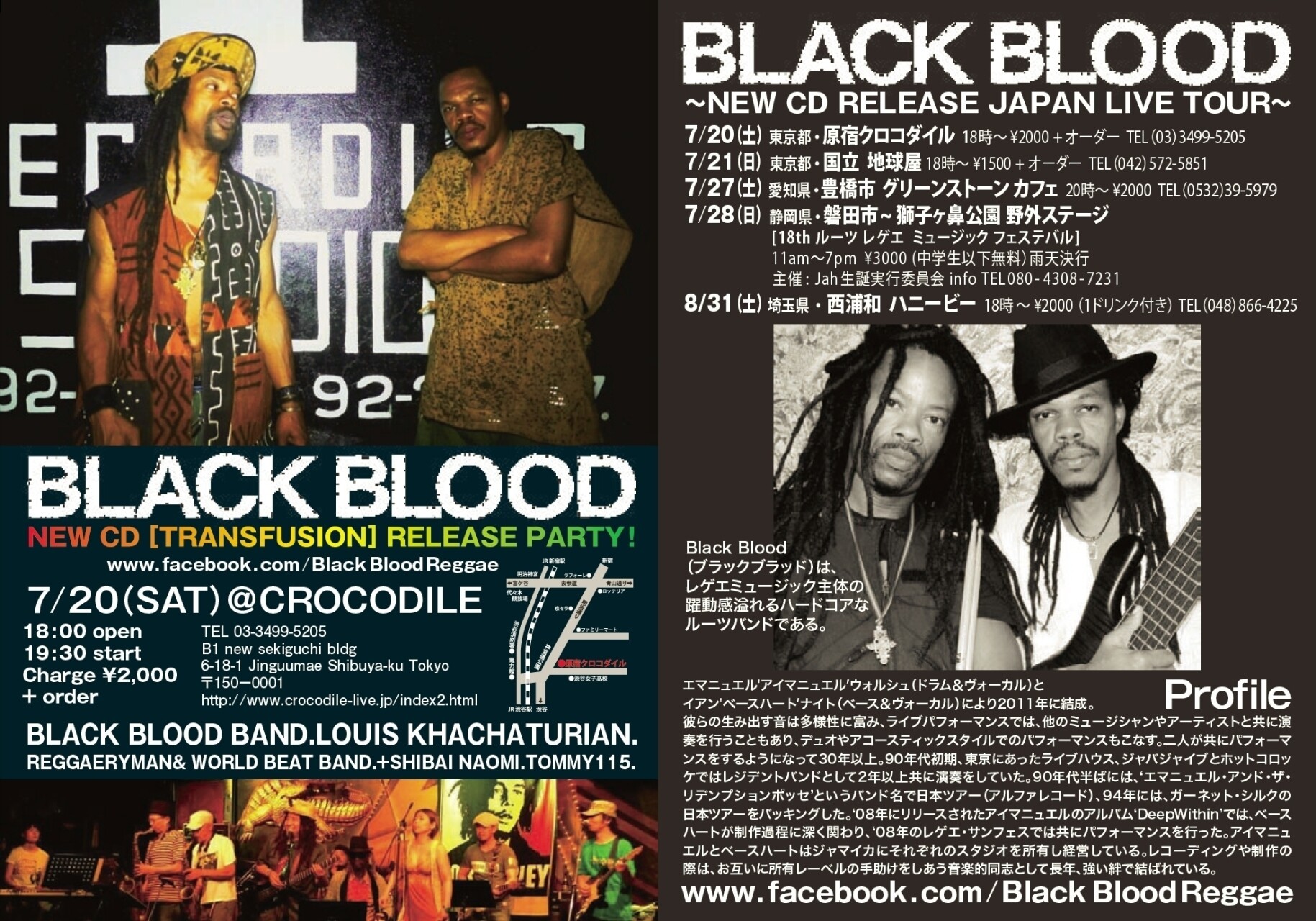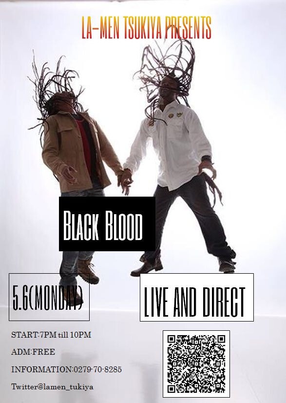 エマニュエル‵アイマニュエル′ウォルシュ(ドラム&ヴォーカル)とイアン‵ベースハート′ナイト(ベース&ヴォーカル)により2011年に結成。Black Blood(ブラックブラッド)は、レゲエミュージックが主体の躍動感溢れるハードコアなルーツバンドである。彼らの生み出す音は多様性に富み、ライブパフォーマンスで他のプロのミュージシャンやゲストアーティストと共に演奏を行うこともある。また、デュオやアコースティックスタイルでのパフォーマンスもこなす。 アイマニュエルとベースハートが共にパフォーマンスをするようになって30年以上が経つ。90年代初期、東京にあったライブハウス、ジャバジャイブとホットコロ...