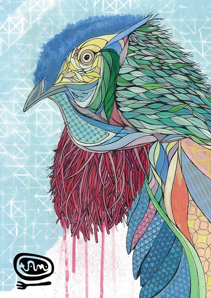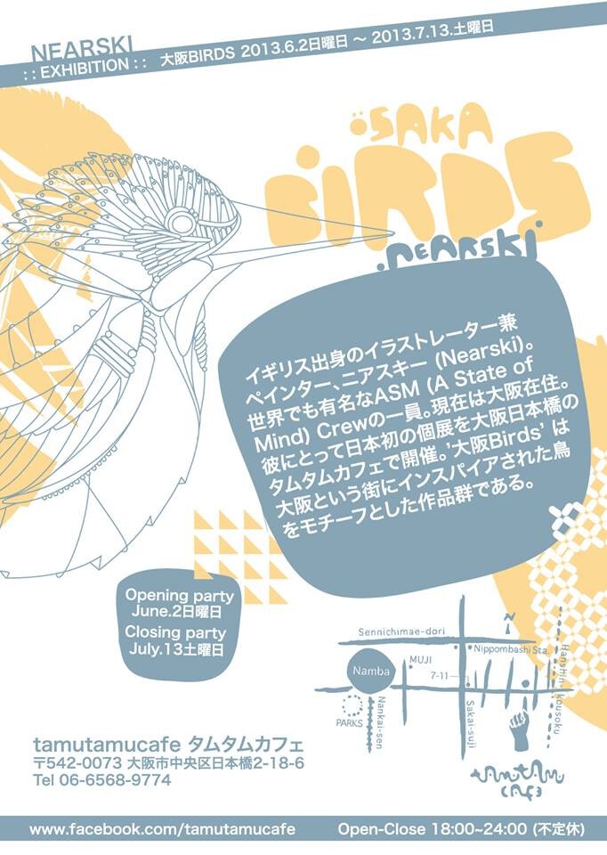 イギリス出身のイラストレーター兼ペインター、ニアスキー (Nearski)。世界でも有名なASM (A State of Mind) Crewの一員。現在は大阪在住。彼にとって日本初の個展を大阪日本橋のタムタムカフェで開催。'Birds' は大阪という街にインスパイアされた鳥をモチーフとした作品群である。