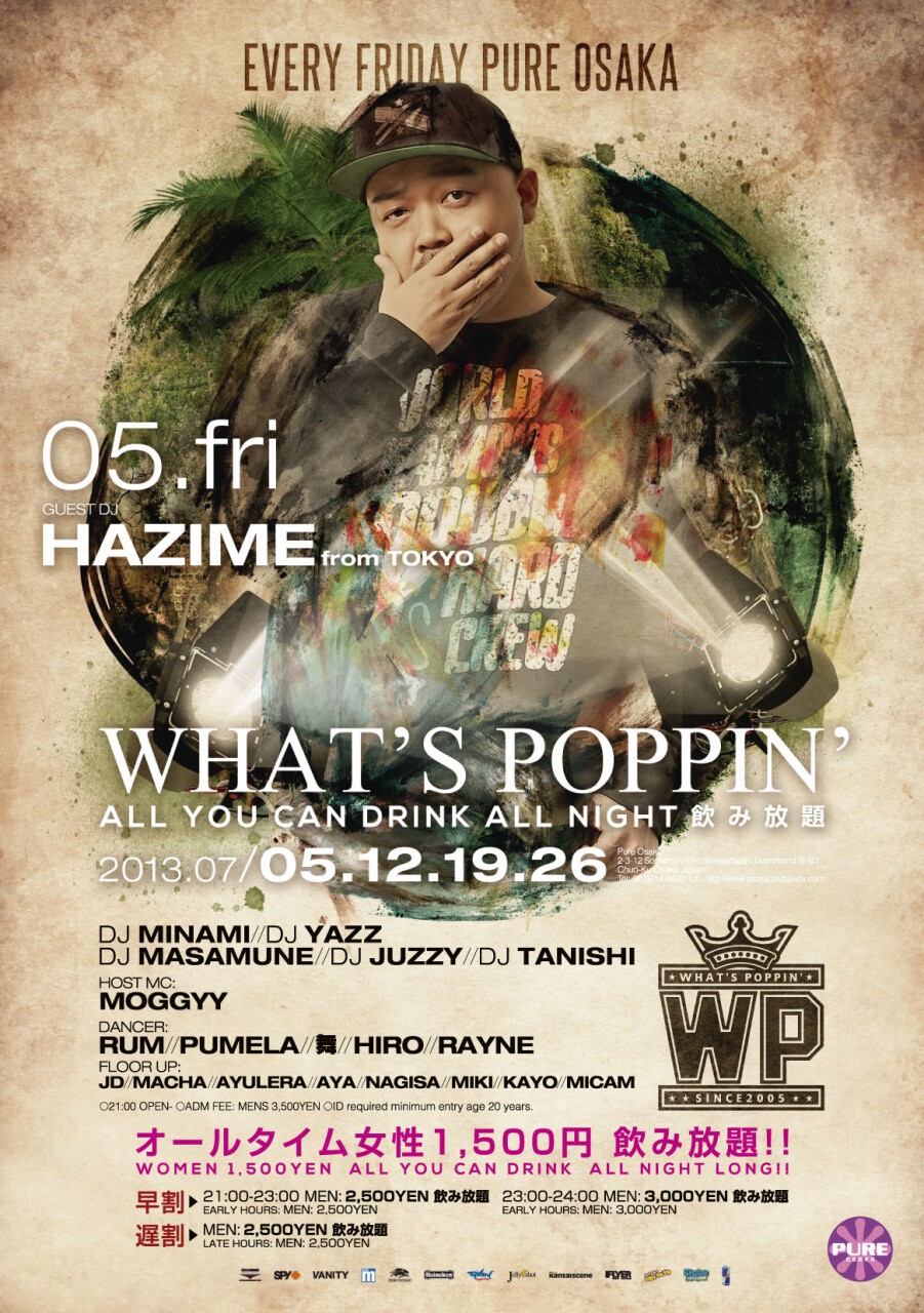 PUREの金曜日は大阪を代表するHIPHOP DJ MINAMI,YAZZ そしてMC MOGGYY がピュアを盛り上げます!