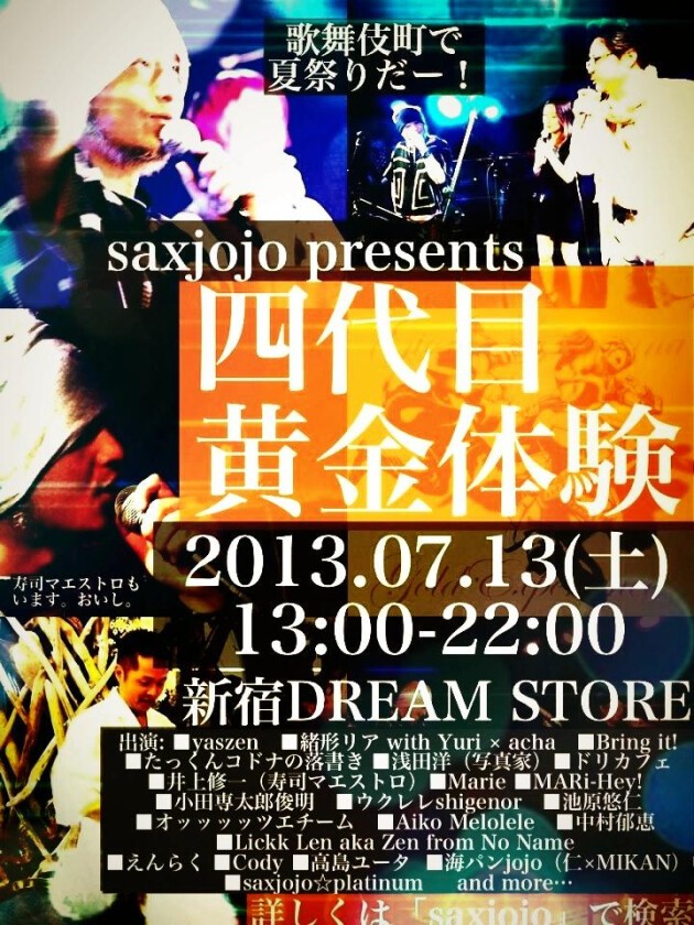 僕が四半期に一度、魂をかける「黄金体験」の日程7/13が近づいてきました。ライブへの参加は直前まで受付できますが、お寿司のご予約は7/7までとなっております。既にコメントいただいてる方は、それでokですが、まだの方は私まで7/7までにメッセージくださいませ。もしくは会場DREAM STOREへtel 03 5287 2286