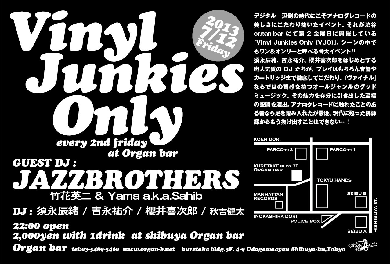 デジタル一辺倒の時代にこそアナログレコード盤=『ヴァイナル』の美しさにこだわり抜いたイベント、それが渋谷organ barにて第2金曜日に開催している『Vinyl Junkies Only(VJO)』。須永辰緒、櫻井喜次郎、吉永祐介をはじめとする職人気質のDJたちが、プレイはもちろん音響やカートリッジまで徹底してこだわり、『ヴァイナル』の魅力を存分に引き出した至福の空間を演出。アナログレコードに触れたことのある者なら足を踏み入れたが最後、現代に甦った桃源郷からもう抜け出すことはできない…!