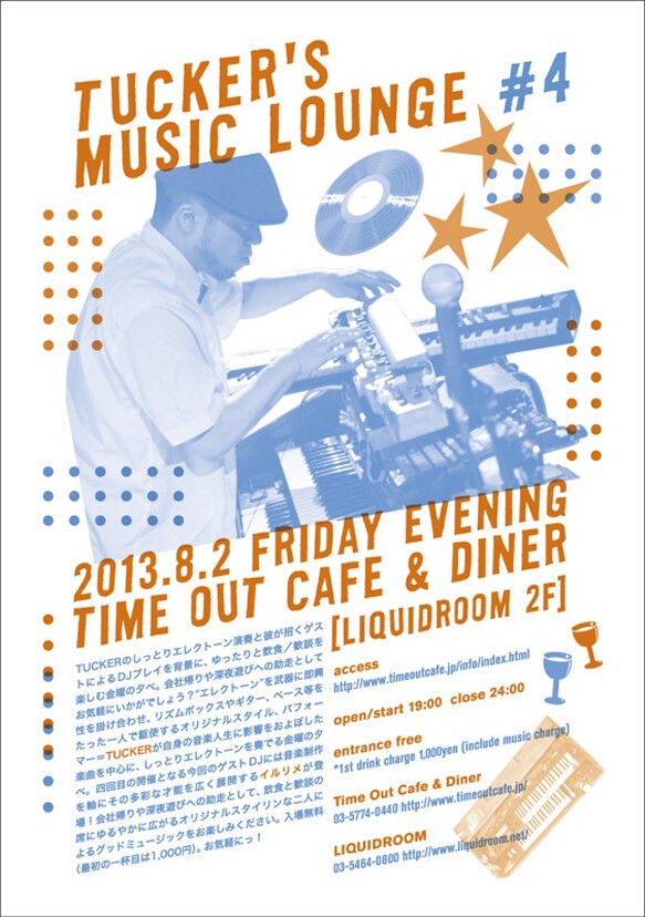 TUCKERのしっとりエレクトーン演奏と彼が招くゲストによるDJプレイを背景に、ゆったりと飲食/歓談を楽しむ金曜の夕べ。会社帰りや深夜遊びへの助走としてお気軽にいかがでしょう?