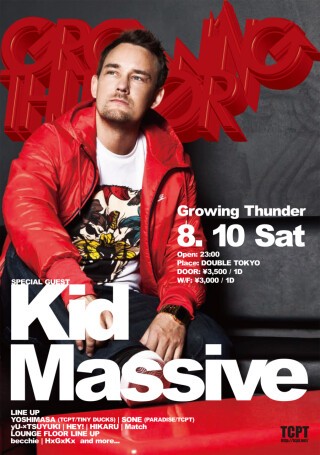 第一回目はFATBOY SLIM、TIESTOがサポートし2012年のFUJI ROCK FESTIVALへの出演や HOUSENATIONへの楽曲提供、日本人ユニットTINY DUCKSとの共作「SMASH IT」が Beatport Progressive Houseチャートで上位に食い込むなど ヨーロッパ、アメリカではもちろん日本でも非常に高い人気を誇るKID MASSIVEが登場!