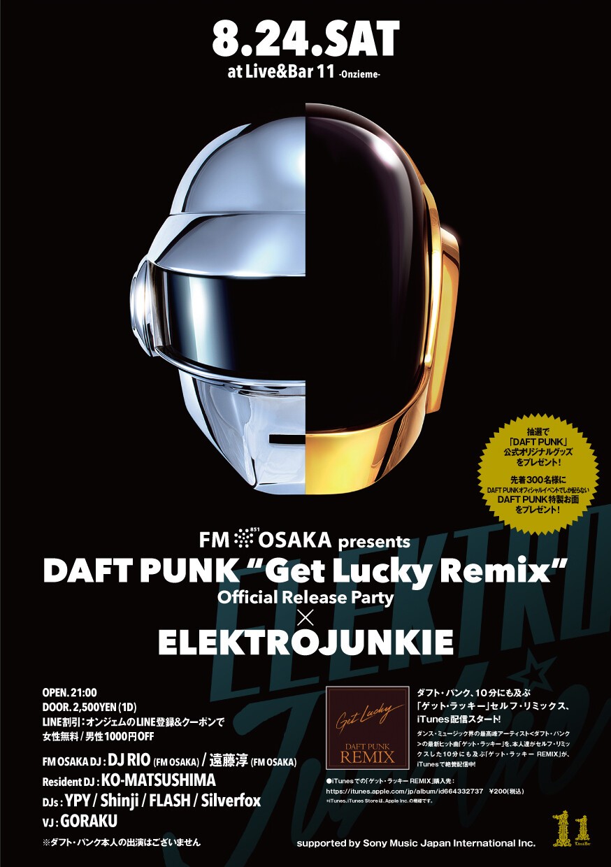 世界最高峰のダンスミュージックアーティスト"DAFT PUNK"8年ぶりのニューアルバム「ランダムアクセスメモリーズ」に収録されている、今年を代表する大ヒット曲、「Get Lucky」のリミックスがリリースされるのに合わせて、オフィシャルパーティーがオンジェムの人気パーティーELEKTROJUNKIEと合体。FM大阪サポートの元、これまでのDAFT PUNKの数々の名曲はもちろん、新アルバムの曲もたくさんかかり、さらに、最新のエレクトロ、EDMサウンドも盛りだくさんの夏のお祭り一夜!