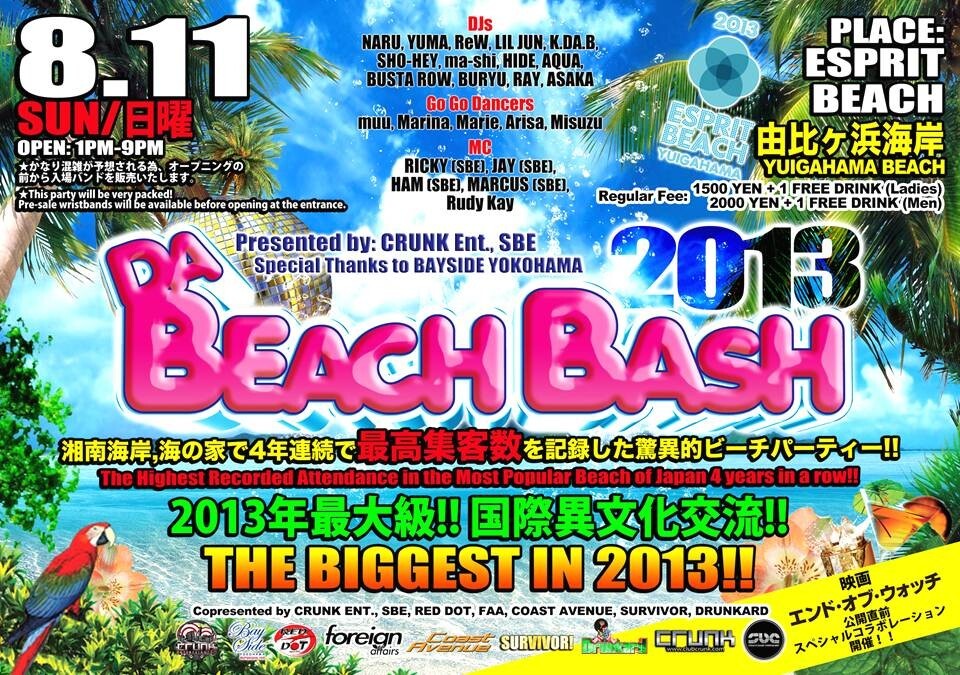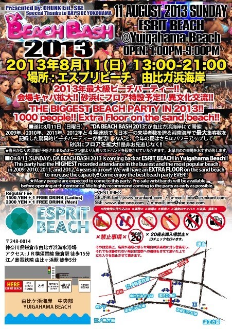On 8/11 (SUNDAY), DA BEACH BASH 2013 is coming back at ESRIT BEACH in Yuigahama Beach!! This party had the HIGHEST recorded attendance in the busiest and the most popular beach in 2009, 2010, 2011, and 2012, 4 years in a row!! Come enjoy the best beach party EVER!!