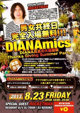 ●CLUB DIANAでは日頃のご愛顧に心より感謝を込め、 「DIANAmics」と題しまして”MEN&WOMEN 終日完全入場無料”にて”真夏の大感謝祭”を開催致します!! なんとこの日は、男女共入場料は一切かかりません!!!(ドリンクは店内でお買い求めください。)しかもしかも、ゲストDJには「DJ ロケットマン(ふかわりょう)」が登場しちゃうんです!!この機会に是非多くのお友達お誘い合わせの上御来店下さい。皆様のご来場、従業員一同心よりお待ちしております。 ※CLUB DIANAオリジナルCD「DIANA MIX」を先着100名様にプレゼント!