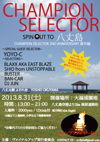 音楽がデジタル化され形を無くしデータ化される時代。そんな時代に真っ向から逆らうかのように横浜、横須賀をレペゼンするサウンドのセレクター陣がレコード&NO MC のDISCO スタイルでお届けするダンス「CHAMPION SELECTOR ~DISCO STYLE IN THE MOONLIGHT~」が横浜の老舗、BAR MOVE(EX SUZY)にて2011年よりスタート。二周年を迎える本年は番外編として、スペシャルゲストにあのYOYO-Cを迎え八丈島へspin out!!!