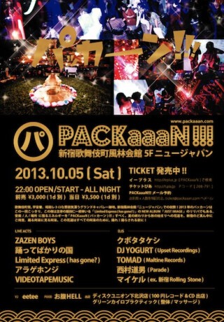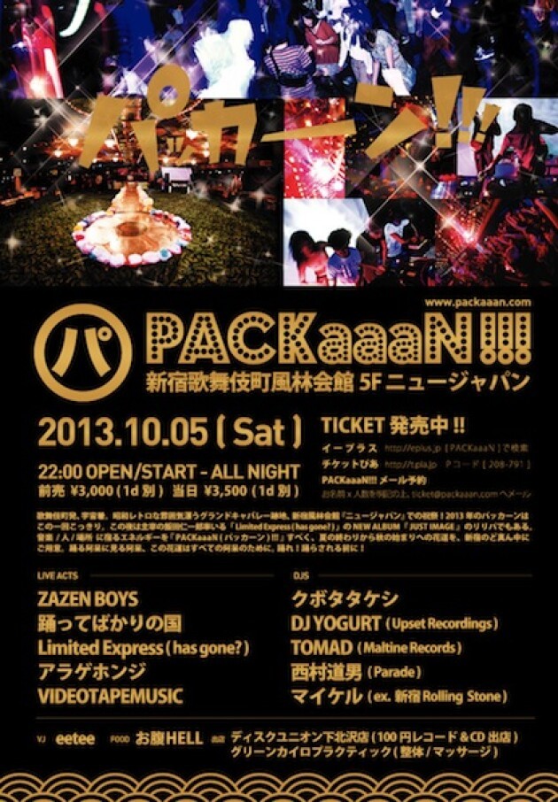 歌舞伎町発、宇宙着。昭和レトロな雰囲気漂うグランドキャバレー跡地、新宿風林会館『ニュージャパン』での祝祭!2013年のパッカーンはこの一回こっきり。この夜は主宰の飯田仁一郎率いる「Limited Express (has gone?)」のニューAL『JUST IMAGE』のリリパでもある。音楽/人/場所に宿るエネルギーを『PACKaaaN(パッカーン)!!!』するべく、夏の終わりから秋の始まりへの花道を、新宿のど真ん中にご用意。踊る阿呆に見る阿呆、この花道はすべての阿呆のために。踊れ!踊らされる前に!
