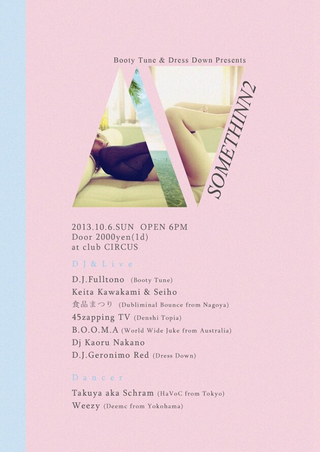 LIVEアクトには名古屋から今やjukeシーンでお馴染み”食品まつり aka FOODMAN” オーストラリアからWorld Wide Jukeシリーズにも参加した”B.O.O.M.A” KEITA KAWAKAMIとのセッションを披露する”seiho”はSOMETHINN初登場。そしてDRESS DOWNのレギュラーDJであり、今話題の160or80で特典DJ MIXを担当した”D.J. Geronimo Red”が久しぶりにカムバック!
