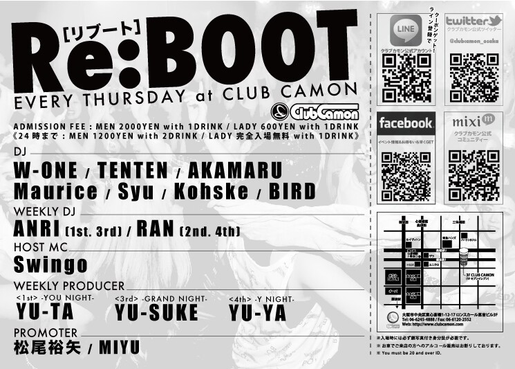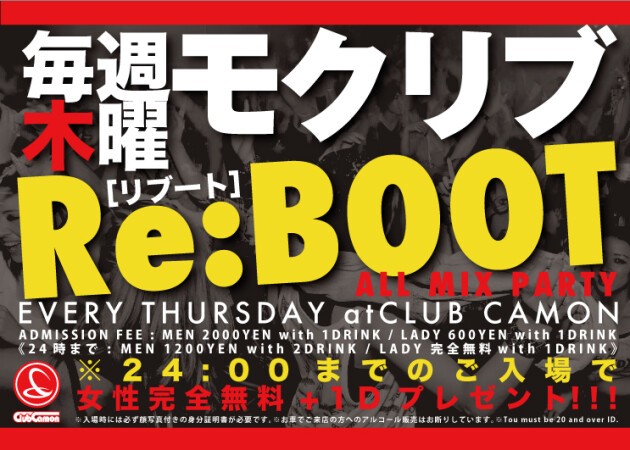 【毎週木曜モクリブ】話題沸騰の木曜カモンはALL MIX PARTY『Re:BOOT [リブート]』☆☆24時まで全員入場無料&女性は1Dプレゼント★★24時以降もSNS割で超お得☆☆