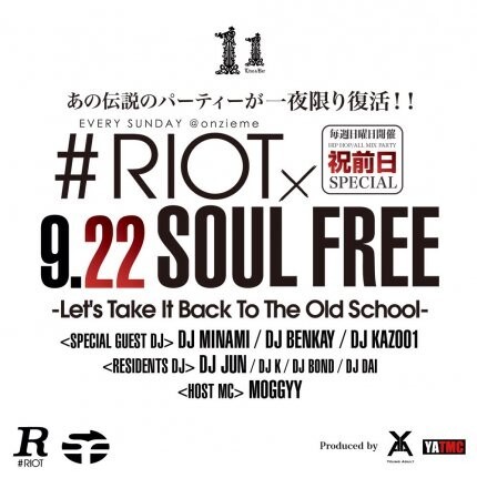 元祖、毎週日曜日の夜遊びのパーティーを盛り上げてきたオンジェムで 新たに新定番のヒップホップ&ALL MIX パーティーが始動!! その名も♯RIOT(♯ライオット) DJは期待のルーキーが勢揃い。
