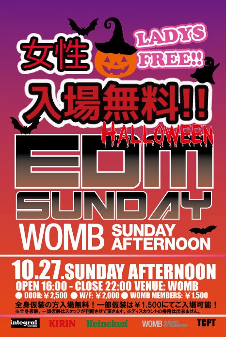 もちろん今回も女性入場無料、女性限定フリーチョコレート、女性専用シートと EDM 好きだけど遊ぶきっかけがないという女性に優しい特典いっぱいです。今回は Halloween Party!!