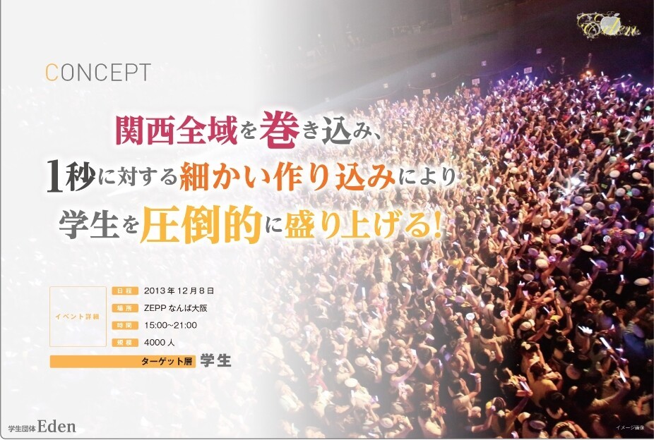 今回、弊団体が提案するのは”1秒への作り込み”です。 関わる全ての人が瞬間瞬間にどれだけの”想い”を込めてパフォーマンスできるか? それが、団体のコンセプトである”究極のエンターテイメントの追求”であると考えています。 コンテンツには、プロジェクションマッピングを駆使し、最新技術と人間のパフォーマンスを組み合わせたファッションショー 桁違いに豪華なDJ、MCによるDJ TIME!! 日本最高峰のレベルを誇るダンスショーケース! そして、スペシャルシークレットゲストによるLIVEコンサート! その他、Edenおなじみの、豪華プレゼントtime、Edenらしい豪華な空間演出など! 5時間ノンストップのEdenが作り出す物語を是非ご堪能ください? そんな、たくさんの人の”こだわり””想い”がどんな化学反応をおこすか? あなたもご覧になりませんか?