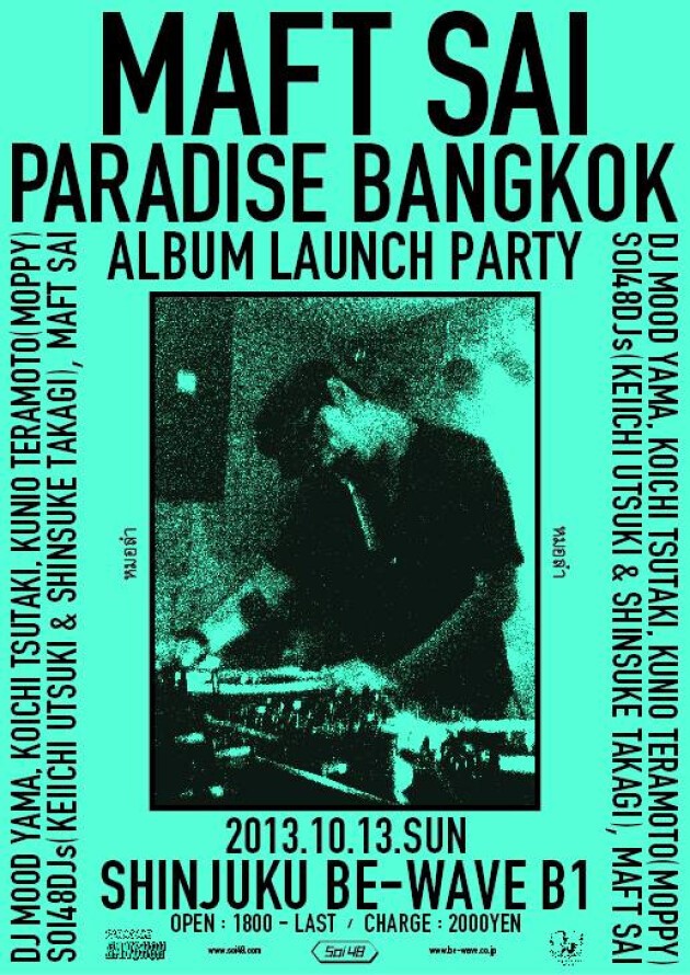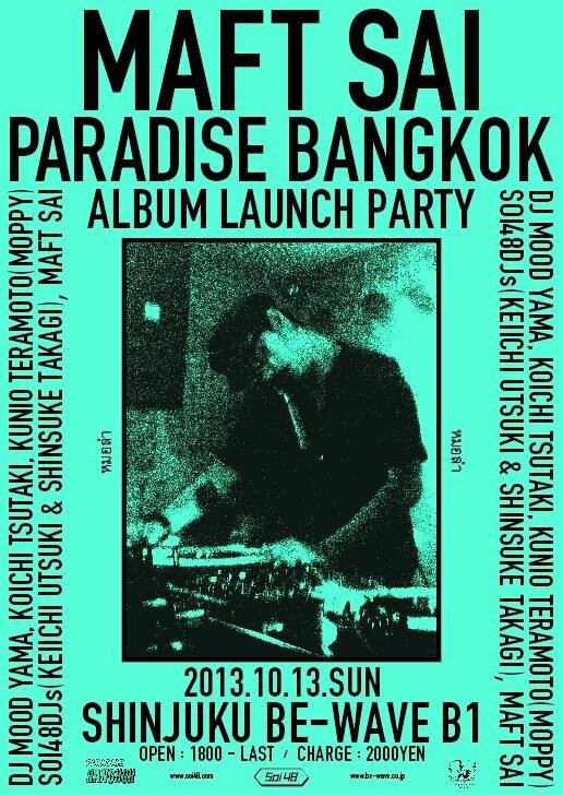 6月の大阪、京都、東京を回ったISAN DANCEHALLツアー。バンドを引き連れた8月のヨーロッパ・ツアー。そして9月のバンコクでのISAN DANCEHALL MELAYU SPECIALSでのSOI48との共演を経てMAFT SAIがまた日本に戻ってくる!! 今回は大阪、福岡、そして最終日は東京でPARADISE BANGKOK ALBUM発売記念PARTY。同日MAFT SAIの相棒CHRIS MENISTはロンドンにてSOUNDWAYのMILES CLERETと発売記念パーティー開催。ロンドン、東京の2都市でモーラムが鳴り響く!!