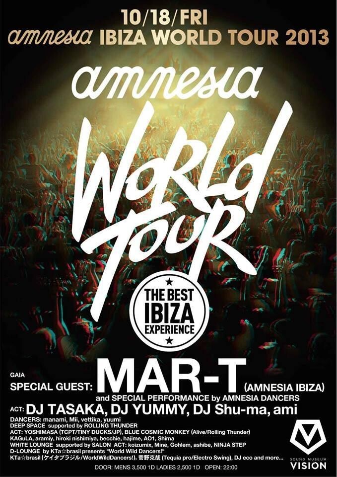 イビサ島最大級の5,000人のキャパシティを誇り、泡パーティ等のラグジュアリーな演出によって世界のクラブシーンの潮流を変えたといっても過言ではないAMNESIA。そのワールドツアーの東京版が、ここVISIONで開催される。メインアクトを務めるのは、AMNESIA不動のレジデントDJである MAR-Tだ。Richie Hawtin、Sven Vath、Paul van dyk、Armin van Buuren、Roger Sanchezといった同クラブに招聘される超ビッグネームたちとの競演で磨き抜かれてきたプレイスキルを、思う存分に体感してほしい。現地の華やかな空気を完全再現するダンサーたちのパフォーマンスにも、期待は高まるばかりだ。