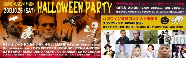 年々街行く人びとの仮装のクオリティが高まり、東京でもすっかり秋のエキサイティングな風物詩として浸透した感のあるハロウィーン。この妖しくもゴージャスなシーズンにVISIONがお贈りするビッグパーティは、何とも豪華なアーティストラインアップとなった。GAIAには、RIP SLYMEからususとILMARI、さらにDEXPISTOLS、80KIDZといった魅惑のDJたちが登場。そしてDEEP SPACEでは、DJ KYOKOを初めとするフィメールDJたちが華麗にフロアを盛りあげていく。仮装コンテスト・グランプリに輝いた人へプレゼントされるハワイ旅行を目指して、とっておきの衣装で刺激的な一夜に身を投じよ!