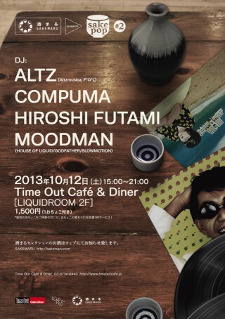 ナイスすぎるあの企画がうまいぐあいに帰ってまいりました。こりゃ、ね。酒飲みはね。もうね。リラックスド&チルな娯楽ドリンク最高峰、良さの塊、まさに人生狂わすニクいやつ、その名は日本酒。日本酒チルアウトな新機軸パーティー“sake pop”。リキッドルーム2階のTime Out Cafe & Dinerにて帰ってまいります! 第1回、初夏の開催から少々時間が経って肌寒くなる、秋の開催と相成ります。日本酒をこよなく愛するナイスすぎる素敵な会『酒丸』セレクション、さまざまな日本酒を集めてレッツラー・パーティー&飲酒。今回も、うまい酒にはうまいアテ。ということで、アテその1は、音楽であります。前回は若手&ナイス・ミドルがくんずほぐれつ乱れるDJの人選でありましたが、今回はうまいぐあいにオヤG汁が豊年満作な、一癖も二癖もあるナイス・ミドル・オンリーなアダルトなラインナップ。DJはMOODMANとCOMPUMAという、ご当地ではおなじみ、酒も音楽も、そのうまみも辛みも知り尽くしたのんべえおじさんふたりに、関西が生んだユル腰に来るグルーヴ魔人、ALTZ、そしてキラリと光るそのサングラスの裏に魔性の魅力を称えたHIROSHI FUTAMIが登場。老若男女の杯をすすめる極上のアテ・グルーヴを会場に注ぎます。もちろん音楽は前回に引き続き和モノ・オンリーです! さらには、アテその2は、もちろん舌を日本酒とともに楽しませる小粋なおつまみも。寒くなりはじめる時期ですので、熱燗も良し、暖かいお部屋でキリリとした冷や酒もイイですね。お帰りは千鳥足にて、御足下にご注意くださいませ~。(河村祐介)