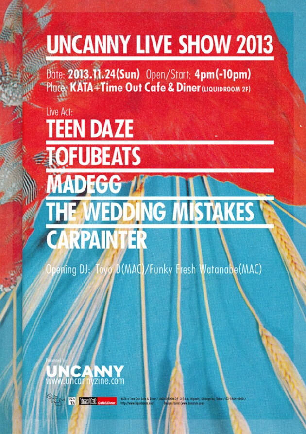 音楽専門ウェブジン『UNCANNY』主催のライブイベント<UNCANNY LIVE SHOW 2013>が開催。2013年に、サイト内でもアクセス数など人気の高かったアーティスト5組が出演します。海外からは、9/17にニュー・アルバム『Glacier』をリリースしたカナダのドリームポップ・アーティストTeen Dazeが出演。そして、国内からは、今年ファースト・アルバム『lost decade』をリリースし、メジャー契約を果たしたtofubeats、〈Day Tripper Records〉よりアルバム『Kiko』をリリースし、海外メディアからの評価も高いMadegg、LASTOrderとMiiiによる新たなポスト・ロックプロジェクトThe Wedding Mistakes、〈Maltine Records〉よりリリースしたEP『Double Rainbow』が話題のCarpainterがライブ出演します。オープニングDJとして、青山学院大学音楽藝術研究部(MAC)からToyo DとFunky Fresh Watanabeが出演します。